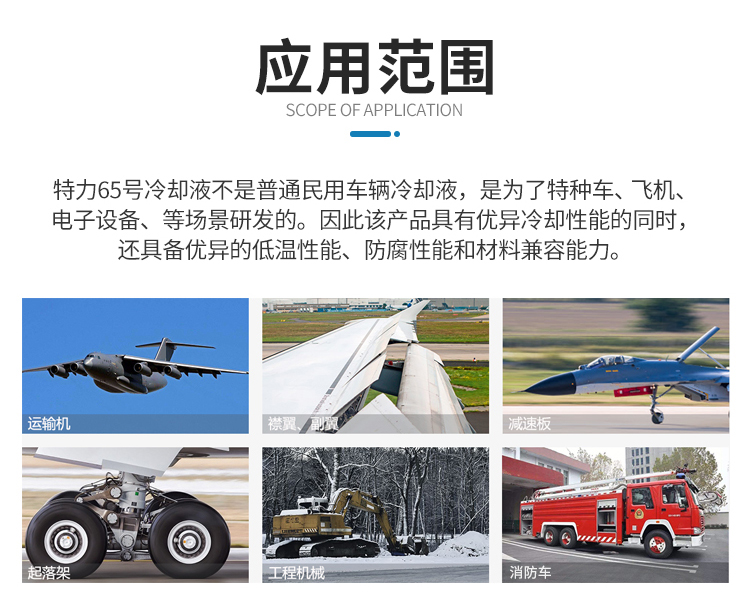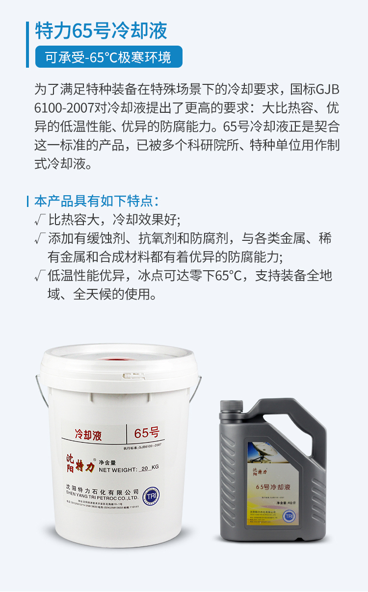 該產品符合國軍標GJB6100-2007執(zhí)行標準,與長城AF65號冷卻液屬于同一種類型的產品,可以互為替換。除了65號之外,特力還提供冷卻液的標號、包裝定制功能:包括40號、45號、50號、60號以及4kg、20kg以及客戶所需包裝服務,歡迎咨詢