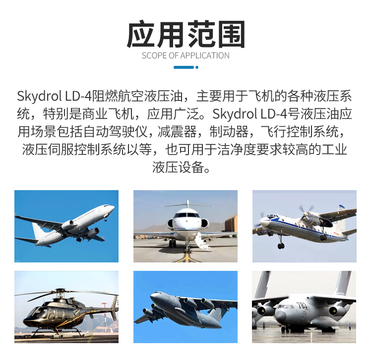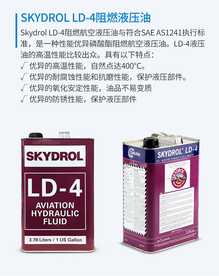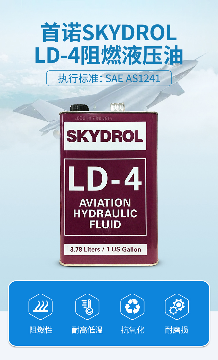 除了Skydrol LD-4之外,河南航材還能為您提供符合AS 1241 V類標(biāo)準(zhǔn)的Skydro 5、Skydrol PE-5型阻燃液壓油,歡迎致電選購(gòu)!